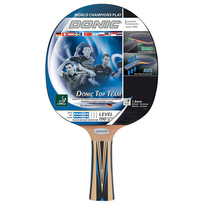 Rakieta „Top Team 700” firmy Donic oferuje wszechstronne osiągi w swoim przedziale cenowym i jest właściwym wyborem dla początkujących i rekreacyjnych. Poza dobrym drewnem i jakością chwytu, ten model rakiety został również wyposażony w zatwierdzoną przez ITTF gumę Donic***, która zapewnia bardzo zrównoważony stosunek między przyspieszeniem a kontrolą dzięki podkładce o grubości 1,8 mm (między gumą a drewnem). Powierzchnia gumy charakteryzuje się dobrą przyczepnością i wartościami rotacji oraz wspomaga różne techniki gry podczas przenoszenia na piłkę, unikając punktów nacisku na palec wskazujący, ponieważ w tej złożonej konstrukcji nie ma ostrych krawędzi. Ta technologia wywodząca się ze sportów wyczynowych znajduje teraz przełożenie w rakietach rekreacyjnych, umożliwiając w ten sposób superszybkie przełączanie z forhendu na bekhend (i odwrotnie). Wbudowana technologia AVS (Anti Vibrations System) pomiędzy ostrzem a rękojeścią wyraźnie redukuje wibracje i drgania, umożliwiając w ten sposób mniej męczące luzy z dużą kontrolą i optymalnym sprzężeniem zwrotnym.